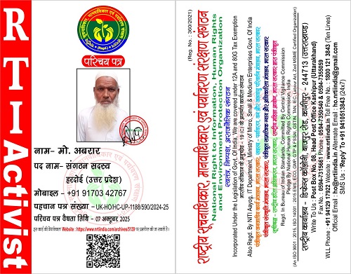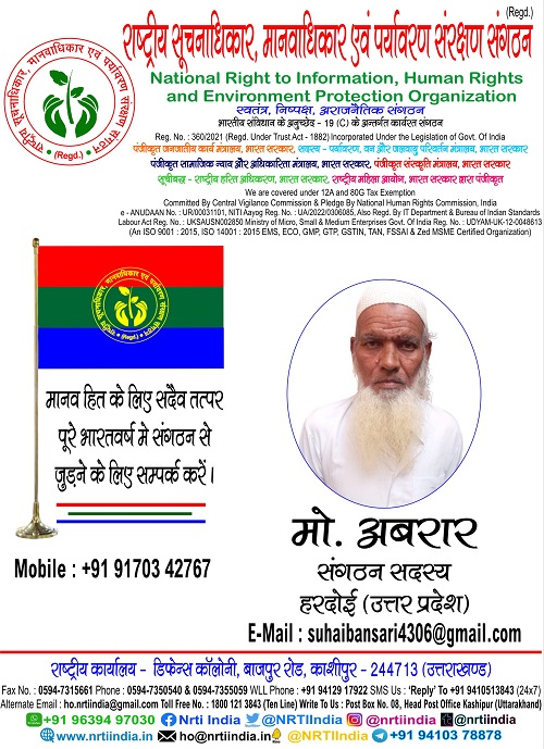 मो. अबरार October 8, 2024 / By NRTI India मो. अबरार संगठन सदस्य हरदोई (उत्तर प्रदेश) मोबाइल : +91 91703 42767 ई – मेल : suhaibansari4306@gmail.com Please follow and like us: