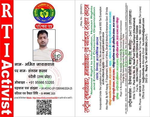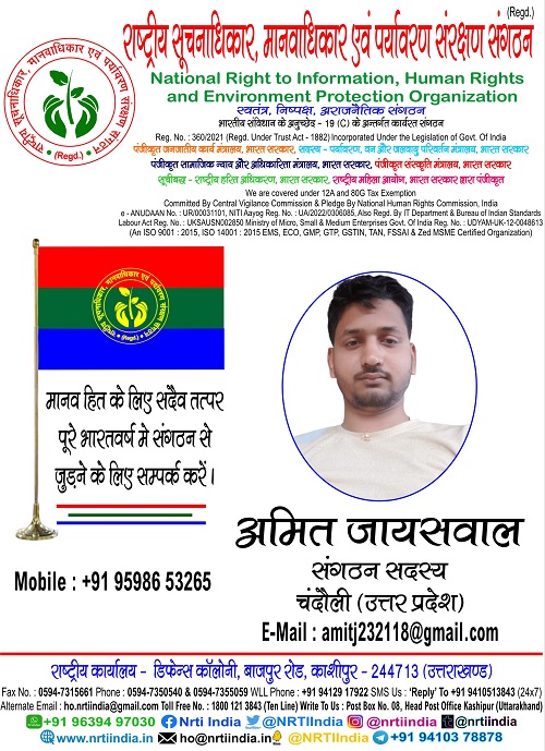 अमित जायसवाल November 6, 2024 / By NRTI India अमित जायसवाल संगठन सदस्य चंदौली (उत्तर प्रदेश) मोबाइल : +91 95986 53265 ई – मेल : amitj232118@gmail.com Please follow and like us: