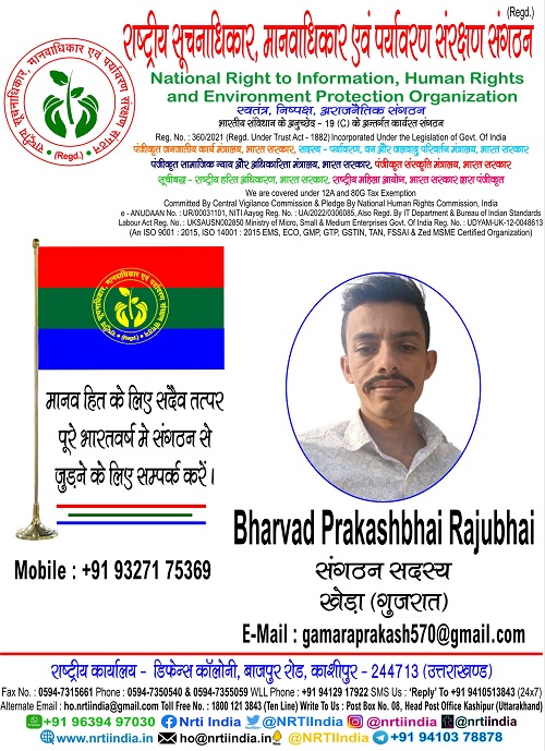 भरवाड़ प्रकाशभाई राजूभाई November 25, 2024 / By NRTI India भरवाड़ प्रकाशभाई राजूभाई संगठन सदस्य खेड़ा (गुजरात) मोबाइल : +91 93271 75369 ई – मेल : gamaraprakash570@gmail.com Please follow and like us: