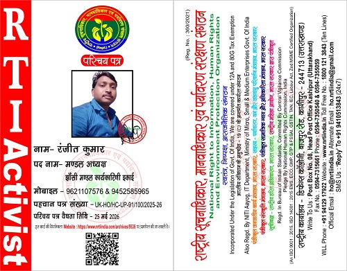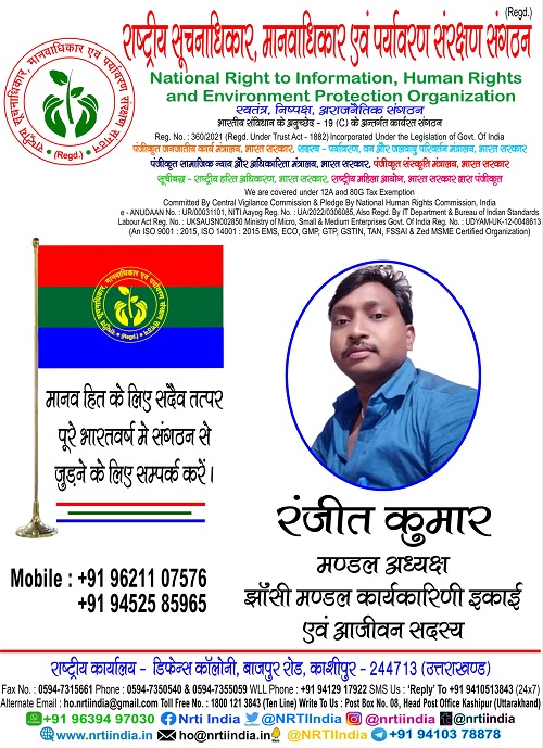 रंजीत कुमार December 7, 2024 / By NRTI India रंजीत कुमार मण्डल अध्यक्ष झाँसी मण्डल कार्यकारिणी इकाई एवं आजीवन सदस्य मोबाइल : +91 96211 07576 & +91 94525 85965