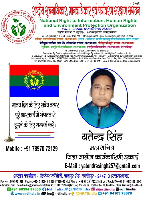 यतेन्द्र सिंह February 20, 2025 / By NRTI India यतेन्द्र सिंह महासचिव जिला जालौन कार्यकारिणी इकाई मोबाइल : +91 78970 72129 ई – मेल : yatendrasingh257@gmail.com Please follow and like us: