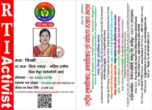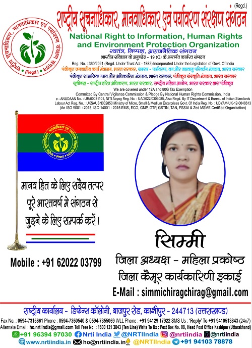सिम्मी March 6, 2025 / By NRTI India सिम्मी जिला अध्यक्ष – महिला प्रकोष्ठ जिला कैमूर कार्यकारिणी इकाई मोबाइल : +91 62022 03799 ई – मेल : simmichiragchirag@gmail.com