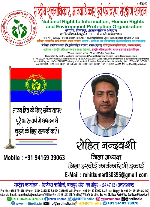 रोहित नन्दवंशी March 19, 2025 / By NRTI India रोहित नन्दवंशी जिला अध्यक्ष जिला हरदोई कार्यकारिणी इकाई मोबाइल : +91 94159 39063 ई – मेल : rohitkumar030395@gmail.com Please follow and like us:
