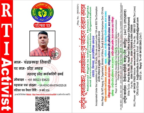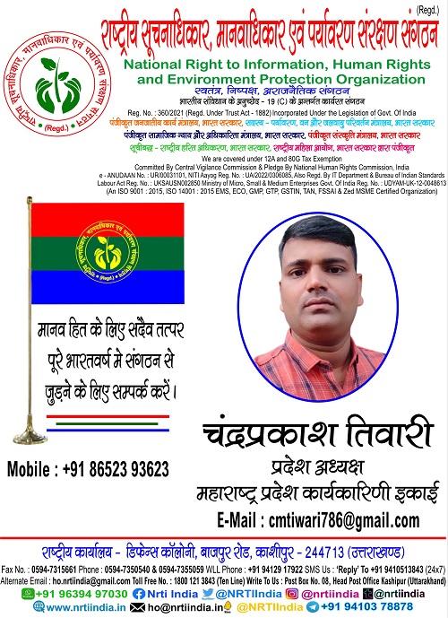 चंद्रप्रकाश तिवारी May 7, 2025 / By NRTI India चंद्रप्रकाश तिवारी प्रदेश अध्यक्ष महाराष्ट्र प्रदेश कार्यकारिणी इकाई मोबाइल : +91 86523 93623 ई – मेल : cmtiwari786@gmail.com