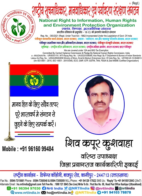 शिव कपूर कुशवाहा May 9, 2025 / By NRTI India शिव कपूर कुशवाहा वरिष्ठ उपाध्यक्ष जिला प्रयागराज कार्यकारिणी इकाई मोबाइल : +91 96160 99484 Please follow and like us: