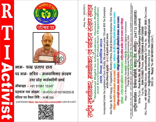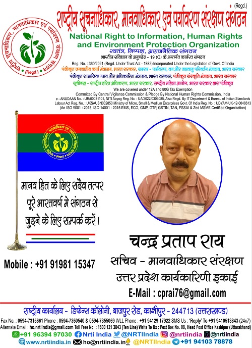 चन्द्र प्रताप राय June 3, 2025 / By NRTI India चन्द्र प्रताप राय सचिव – मानवाधिकार संरक्षण उत्तर प्रदेश कार्यकारिणी इकाई मोबाइल : +91 91981 15347 ई – मेल : cprai76@gmail.com