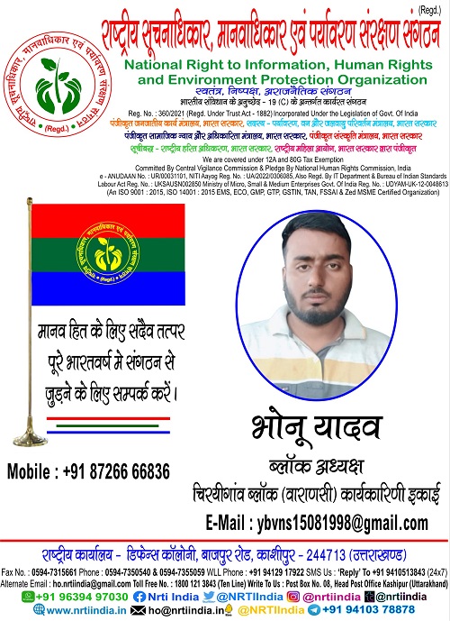 भोनू यादव June 4, 2025 / By NRTI India भोनू यादव ब्लॉक अध्यक्ष चिरयीगांव ब्लॉक (वाराणसी) कार्यकारिणी इकाई मोबाइल : +91 87266 66836 ई – मेल : ybvns15081998@gmail.com