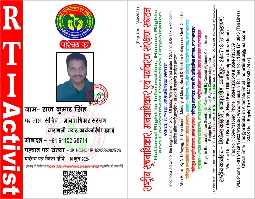 राज कुमार सिंह June 11, 2025 / By NRTI India राज कुमार सिंह सचिव – मानवाधिकार संरक्षण वाराणसी नगर कार्यकारिणी इकाई मोबाइल : +91 94152 68714 ई – मेल : raj_vnsin@yahoo.co.in