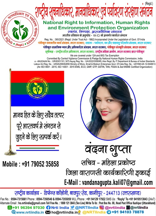 वंदना गुप्ता June 23, 2025 / By NRTI India वंदना गुप्ता सचिव – महिला प्रकोष्ठ जिला वाराणसी कार्यकारिणी इकाई मोबाइल : +91 79052 35858 ई – मेल : vandanagupta.kali07@gmail.com