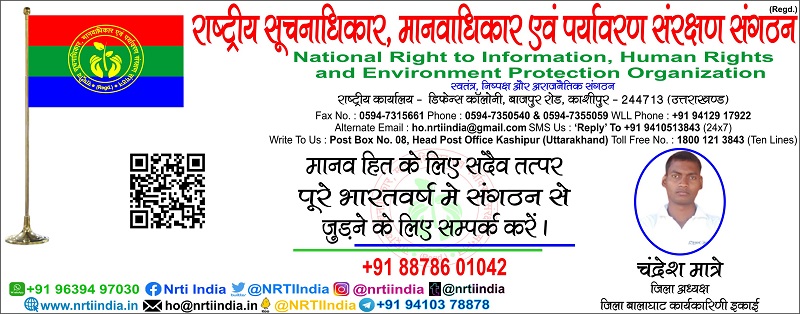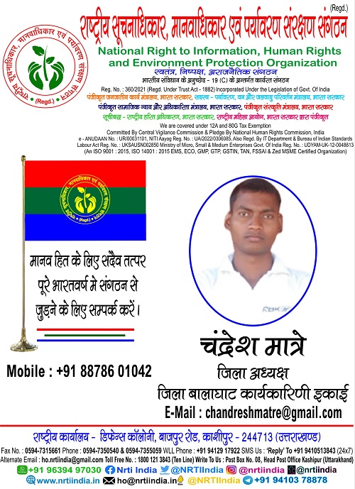 चंद्रेश मात्रे June 27, 2025 / By NRTI India चंद्रेश मात्रे जिला अध्यक्ष जिला बालाघाट कार्यकारिणी इकाई मोबाइल : +91 88786 01042 ई – मेल : chandreshmatre@gmail.com Please follow and like us: