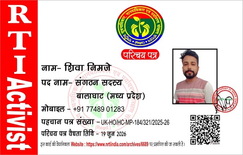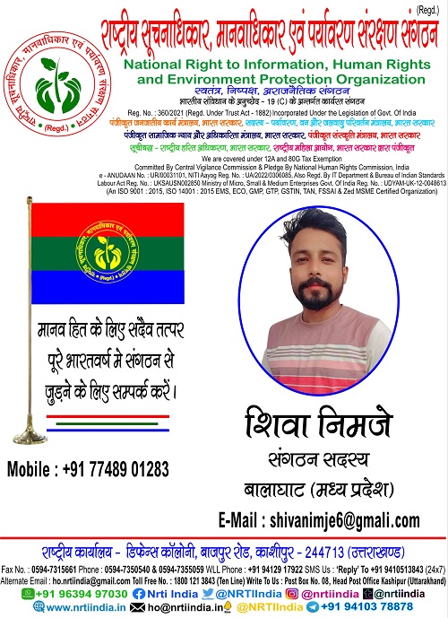 शिवा निमजे June 27, 2025 / By NRTI India शिवा निमजे संगठन सदस्य बालाघाट (मध्य प्रदेश) मोबाइल : +91 77489 01283 ई – मेल : shivanimje6@gmali.com Please follow and like us: