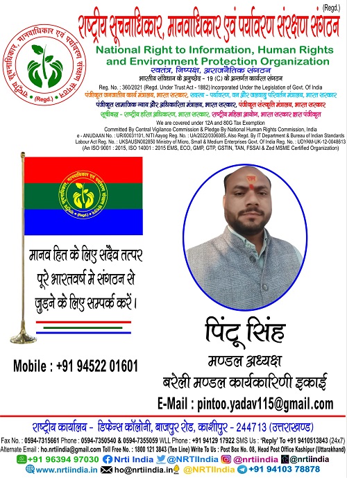 पिंटू सिंह July 2, 2025 / By NRTI India पिंटू सिंह मण्डल अध्यक्ष बरेली मण्डल कार्यकारिणी इकाई मोबाइल : +91 94522 01601 ई – मेल : pintoo.yadav115@gmail.com Please follow and like us: