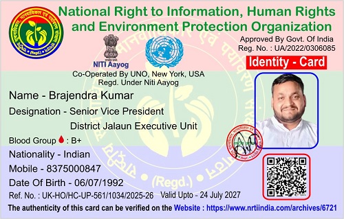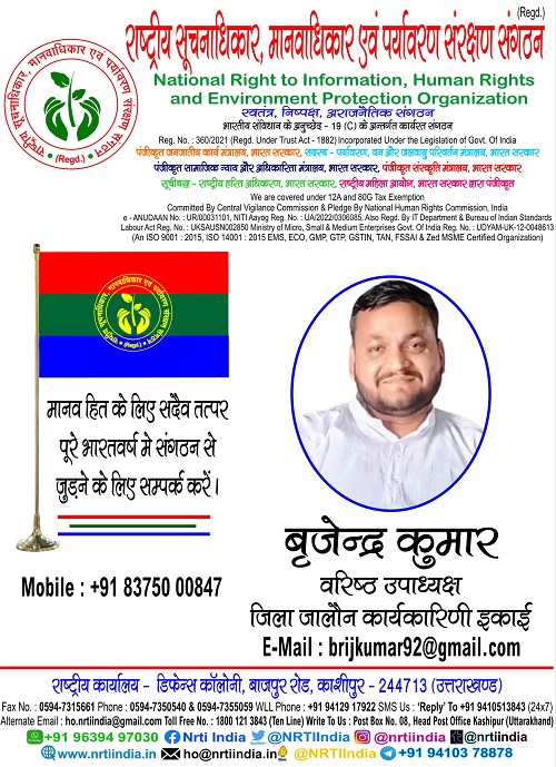 बृजेन्द्र कुमार July 3, 2025 / By NRTI India बृजेन्द्र कुमार वरिष्ठ उपाध्यक्ष जिला जालौन कार्यकारिणी इकाई मोबाइल : +91 83750 00847 ई – मेल : brijkumar92@gmail.com
