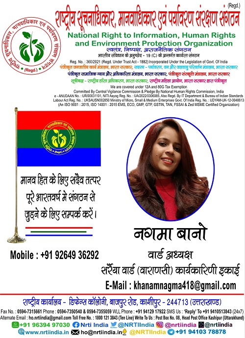 नगमा बानो July 3, 2025 / By NRTI India नगमा बानो वार्ड अध्यक्ष सर्रैया वार्ड (वाराणसी) कार्यकारिणी इकाई मोबाइल : +91 92649 36292 ई – मेल : khanamnagma418@gmail.com