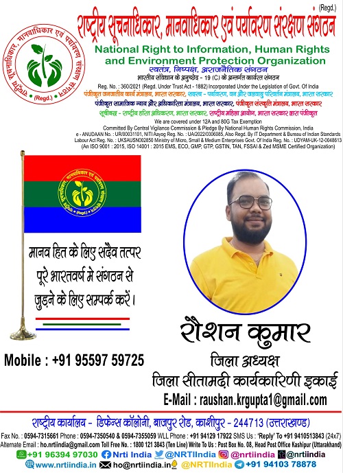 रौशन कुमार July 7, 2025 / By NRTI India रौशन कुमार जिला अध्यक्ष जिला सीतामढ़ी कार्यकारिणी इकाई मोबाइल : +91 95597 59725 ई – मेल : raushan.krgupta1@gmail.com Please follow and like us: