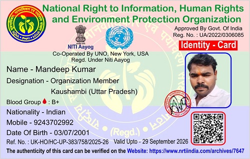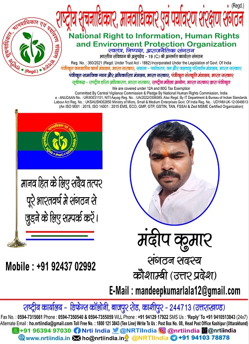 मंदीप कुमार November 8, 2025 / By NRTI India मंदीप कुमार संगठन सदस्य कौशाम्बी (उत्तर प्रदेश) मोबाइल : +91 92437 02992 ई – मेल : mandeepkumarlala12@gmail.com Please follow and like us: