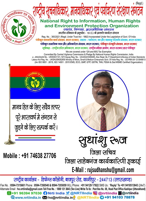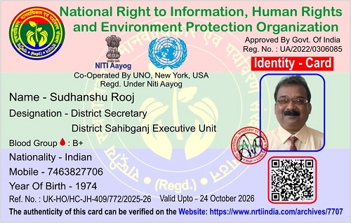सुधांशु रूज November 11, 2025 / By NRTI India सुधांशु रूज जिला सचिव जिला साहेबगंज कार्यकारिणी इकाई मोबाइल : +91 74638 27706 ई – मेल : rujsudhanshu@gmail.com Please follow and like us: