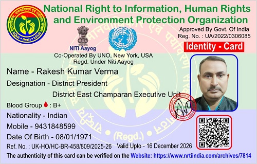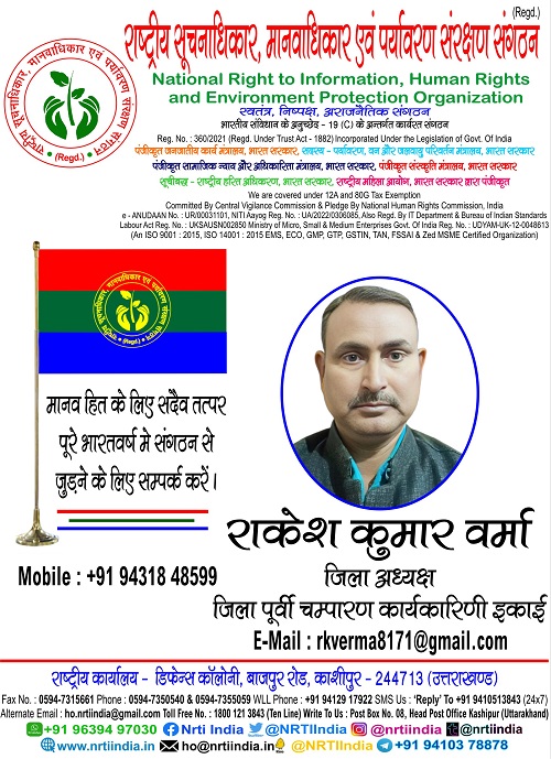 राकेश कुमार वर्मा November 24, 2025 / By NRTI India राकेश कुमार वर्मा जिला अध्यक्ष जिला पूर्वी चम्पारण कार्यकारिणी इकाई मोबाइल : +91 94318 48599 ई – मेल : rkverma8171@gmail.com