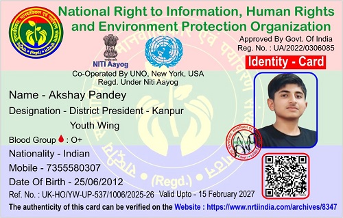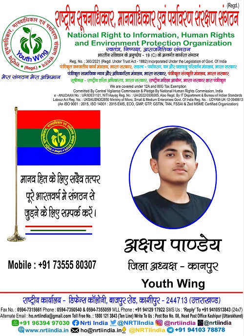 अक्षय पाण्डेय February 11, 2026 / By NRTI India अक्षय पाण्डेय जिला अध्यक्ष – कानपुर Youth Wing मोबाइल : +91 73555 80307 Please follow and like us: