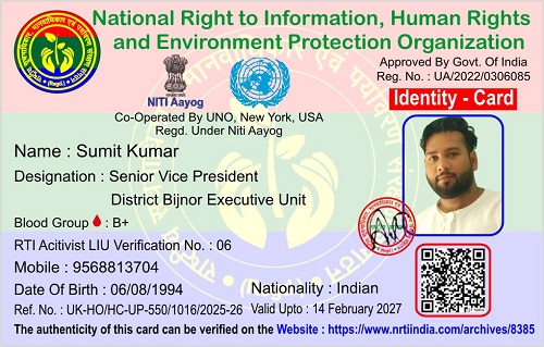 सुमित कुमार February 17, 2026 / By NRTI India सुमित कुमार वरिष्ठ उपाध्यक्ष जिला बिजनौर कार्यकारिणी इकाई मोबाइल : +91 95688 13704 ई – मेल : thakurjisumit9999@gmail.com