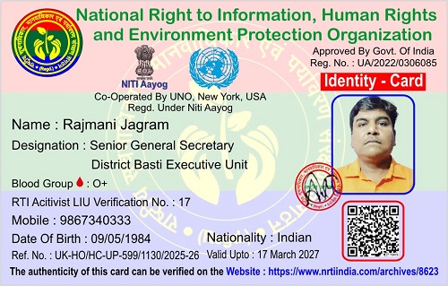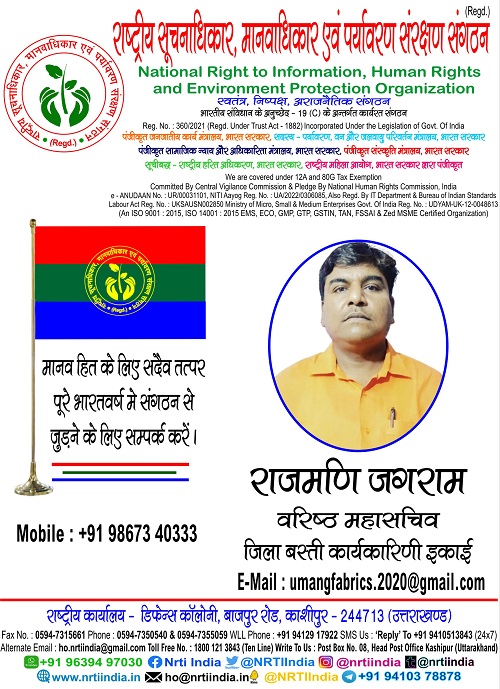 राजमणि जगराम March 27, 2026 / By NRTI India राजमणि जगराम वरिष्ठ महासचिव जिला बस्ती कार्यकारिणी इकाई मोबाइल : +91 98673 40333 ई – मेल : umangfabrics.2020@gmail.com